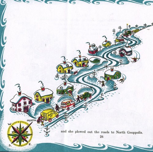 Katy, a red crawler tractor, “could do a lot of things,” Burton explains early on. In the summer she is a bulldozer, helping to build and repair roads in the city of Geoppolis. In the winter, she turns into a snowplow, waiting and waiting for her chance to be useful. Most of the winters, though, the snowfalls are mild and the town doesn’t need Katy. But when the big one finally hits, the town is buried in page after page of powder. The power lines are down. The doctor can’t get his patient to the hospital. The fire department can’t reach a burning house! “Everyone and everything was stopped but… KATY!” Suddenly, the entire community is dependent on one little snowplow.