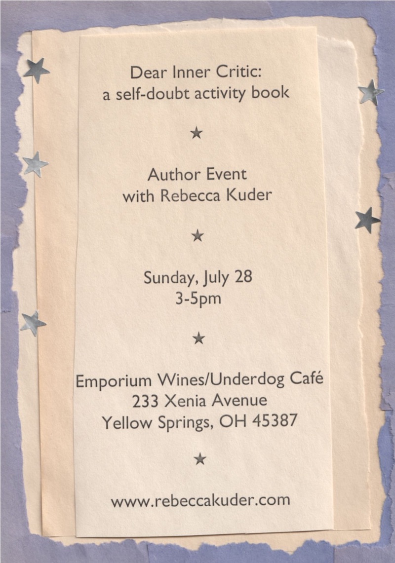Please join me on Sunday, July 28, from 3-5pm, at the Emporium! I will read new stories and then lead an (optional) activity or two from Dear Inner Critic: a self-doubt activity book. Books will be available for purchase.