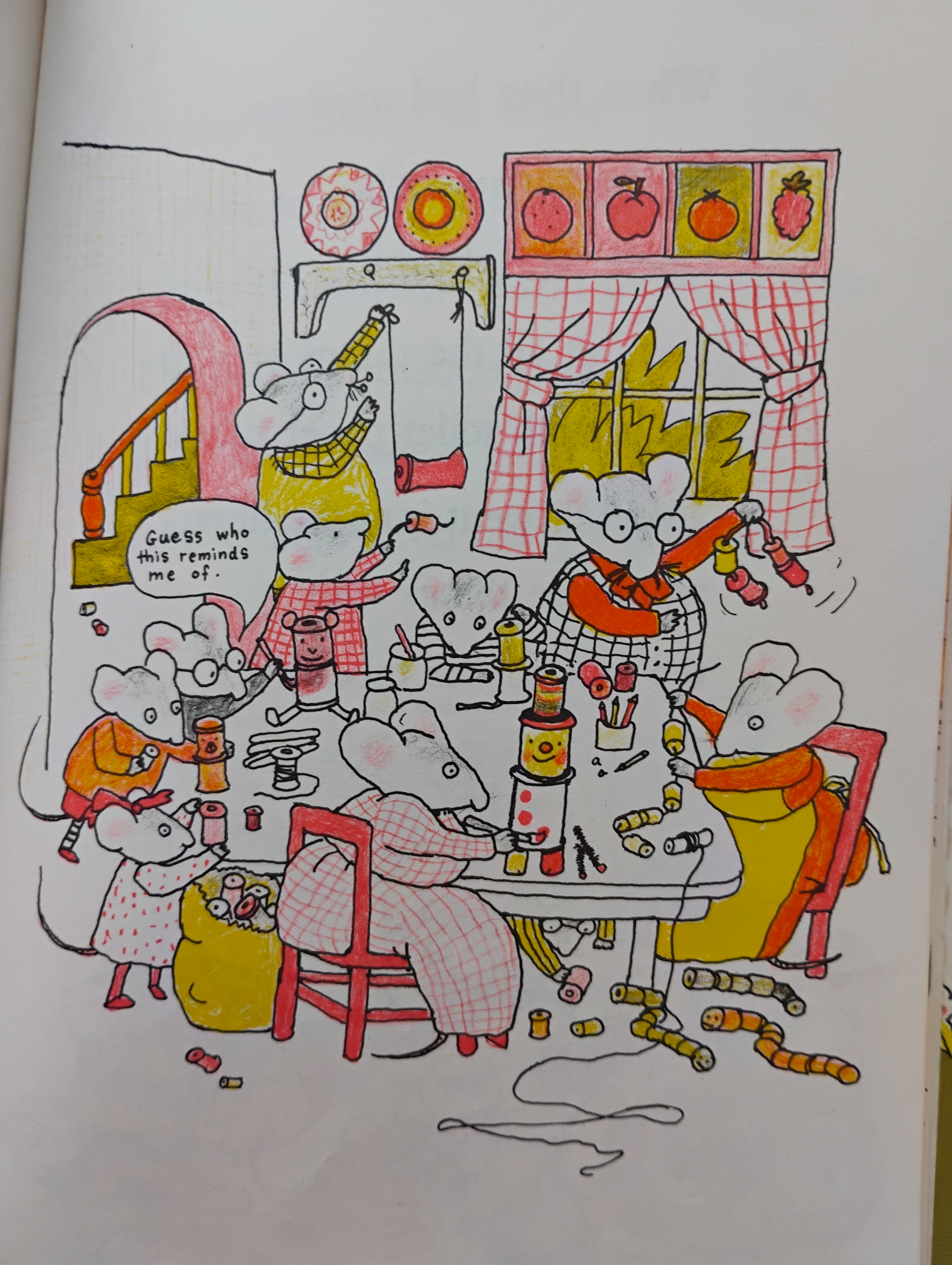Like my neighbor Becky, the illustrations are sweet and more than a little mischievous—these dear mice are always in motion, stuffing toilet paper tubes into bags, tripping over spools. It’s a fabulous book. (It’s out of print, but findable in libraries, and definitely findable on eBay or abebooks.) (Thank you, dear Becky.)