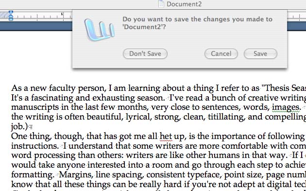 One thing, though, that has got me all het up, is the importance of following instructions. Some writers are more comfortable with computers and word processing than others: writers are like other humans in that way. If I could, I would take all these writers into a room and together, we’d go through each step to achieve proper formatting. Margins, line spacing, consistent typeface, point size, page numbering. I know that these details can be really hard to face if you’re not adept at digital technology. I’m lucky that my previous job was all about showing students and faculty how to navigate the word processing jungle. I’m a nerd about this stuff. According to Microsoft, I am a “Word Expert.” (This always amuses me, especially when I’m writing, because the last thing I feel like is a word expert!) For this reason, however, I harp on formatting. My students might be tired of hearing it, but I am trying to help them as they approach the larger world where their work will be judged by someone who doesn’t care about them nearly as much as I do.