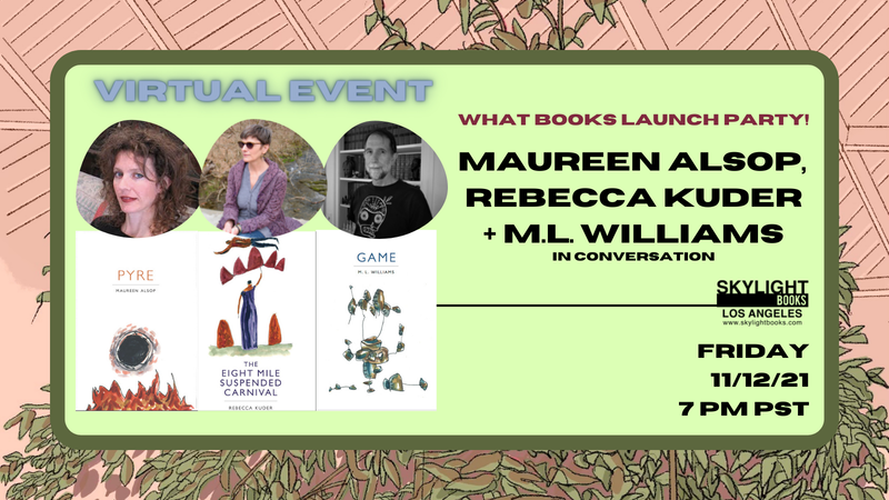 Please join me for the online What Books Press Launch party, hosted by Skylight Books! I will read from my debut novel, The Eight Mile Suspended Carnival, alongside poets Maureen Alsop and M. L. Williams. For more information, or to register, please visit the event page. (Please note the event will be held at 7pm Pacific/10pm Eastern.)