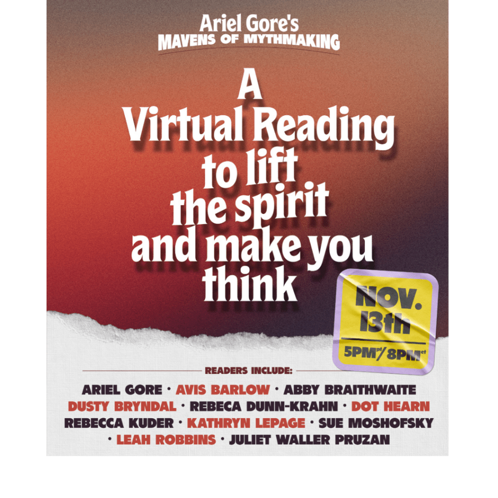 Grateful to be doing a virtual reading with some wonderful people, including Ariel Gore, Avis Barlow, Abby Braithwaite, Dusty Bryndal, Rebeca Dunn-Krahn, Dot Hearn, Kathryn Lepage, Sue Mosofsky, Leah Robbins, and Juliet Waller Pruzan. Join us!